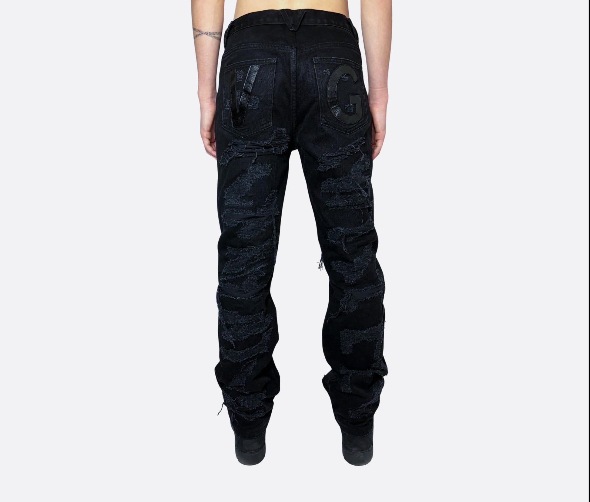 Hand-distressing process, carefully repaired to achieve a distinctive worn effect, ensuring a unique and distinctive style.